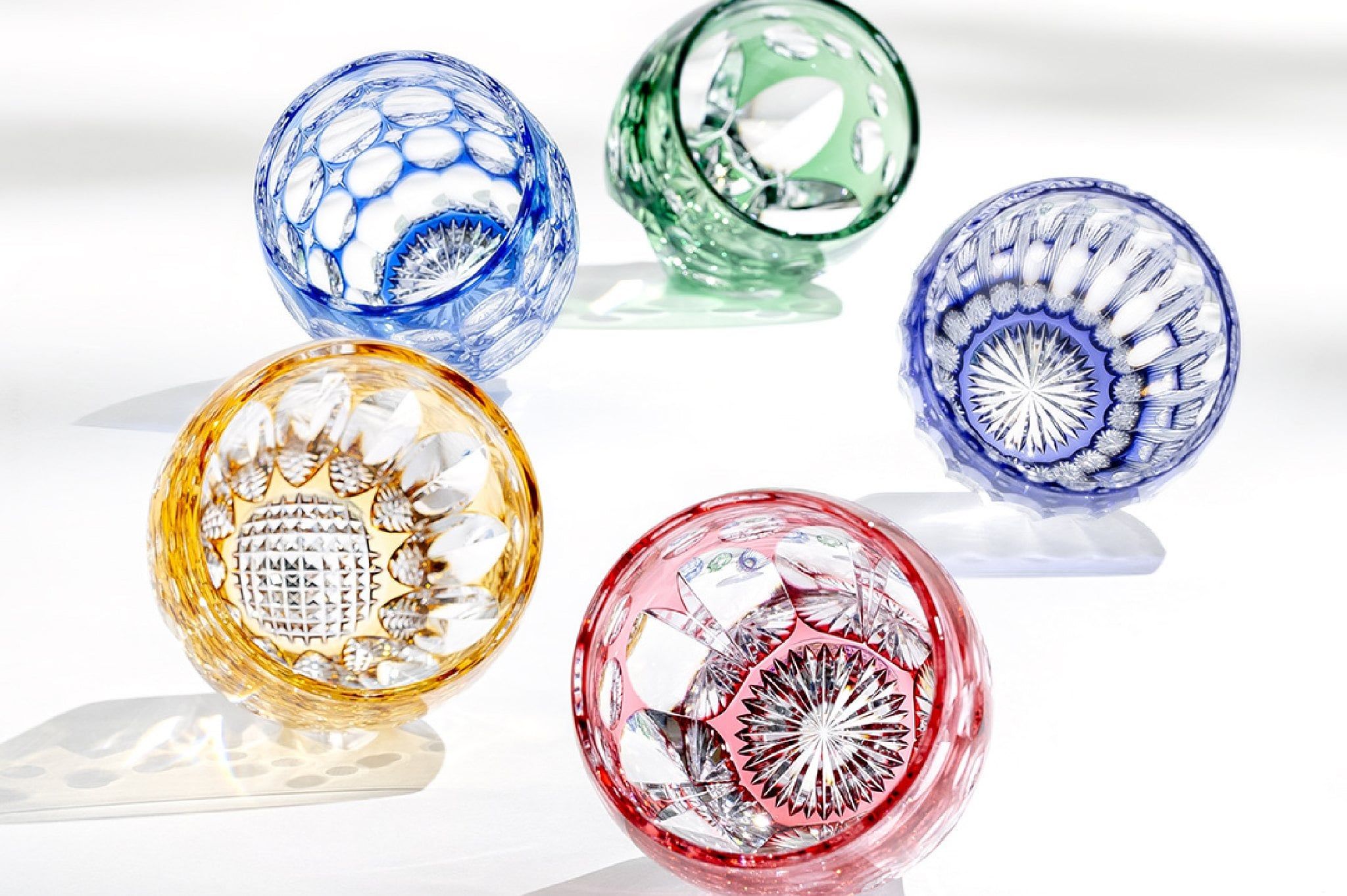 Không chỉ trong suốt, pha lê còn có thể được tạo màu để mang đến những hiệu ứng thị giác độc đáo. Những chiếc chén sake nhiều màu sắc, khi đặt dưới ánh đèn hoặc ánh sáng tự nhiên, sẽ phản chiếu những gam màu dịu dàng và sinh động. Chỉ cần nhìn vào những chiếc ly pha lê rực rỡ ấy thôi cũng đủ khiến tâm trạng trở nên tươi sáng hơn. Khi ánh sáng xuyên qua lớp màu trong suốt của pha lê, bóng đổ tạo ra trên mặt bàn cũng mang sắc thái riêng, làm cho không gian trở nên ấm áp và sống động.