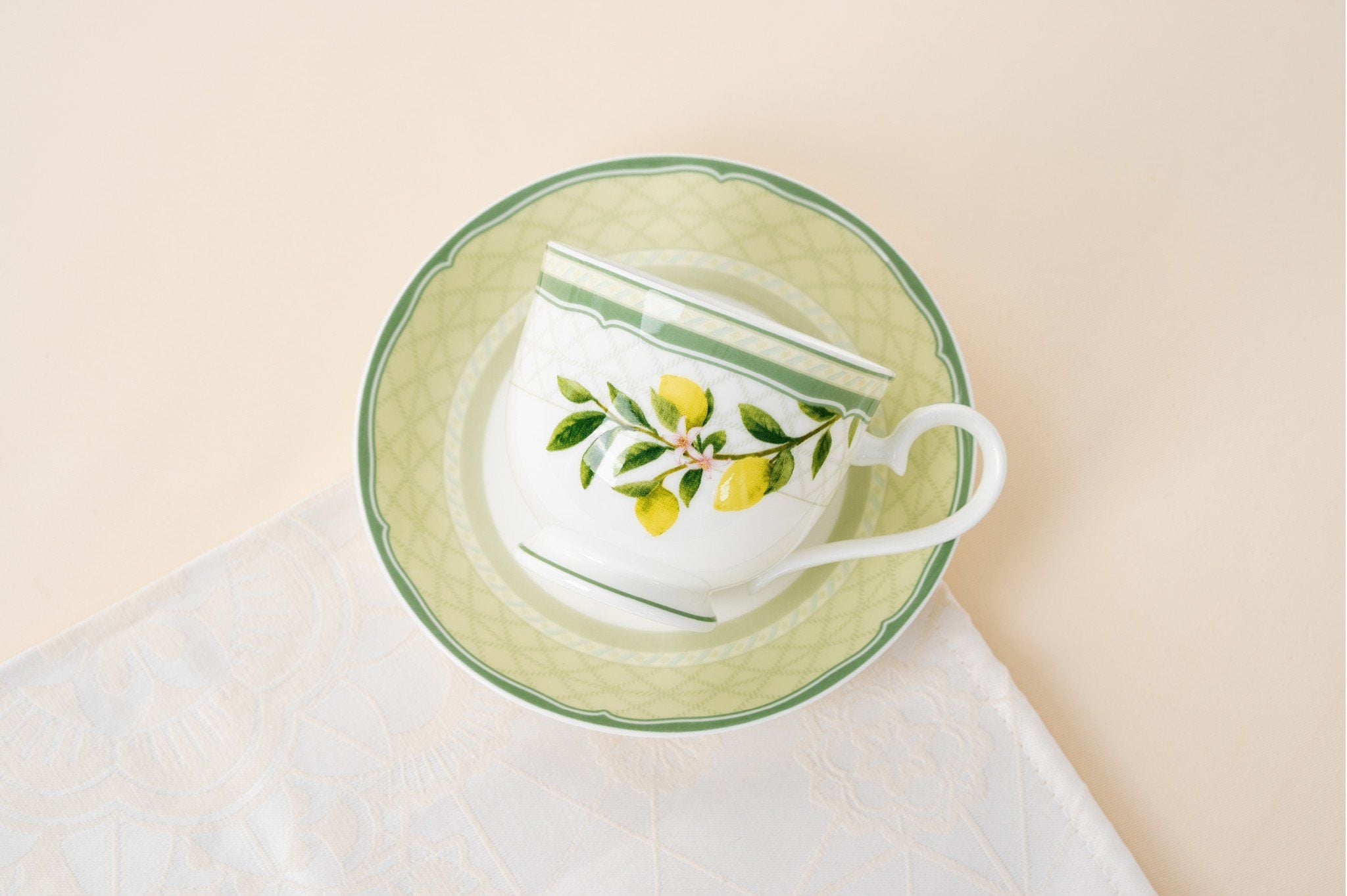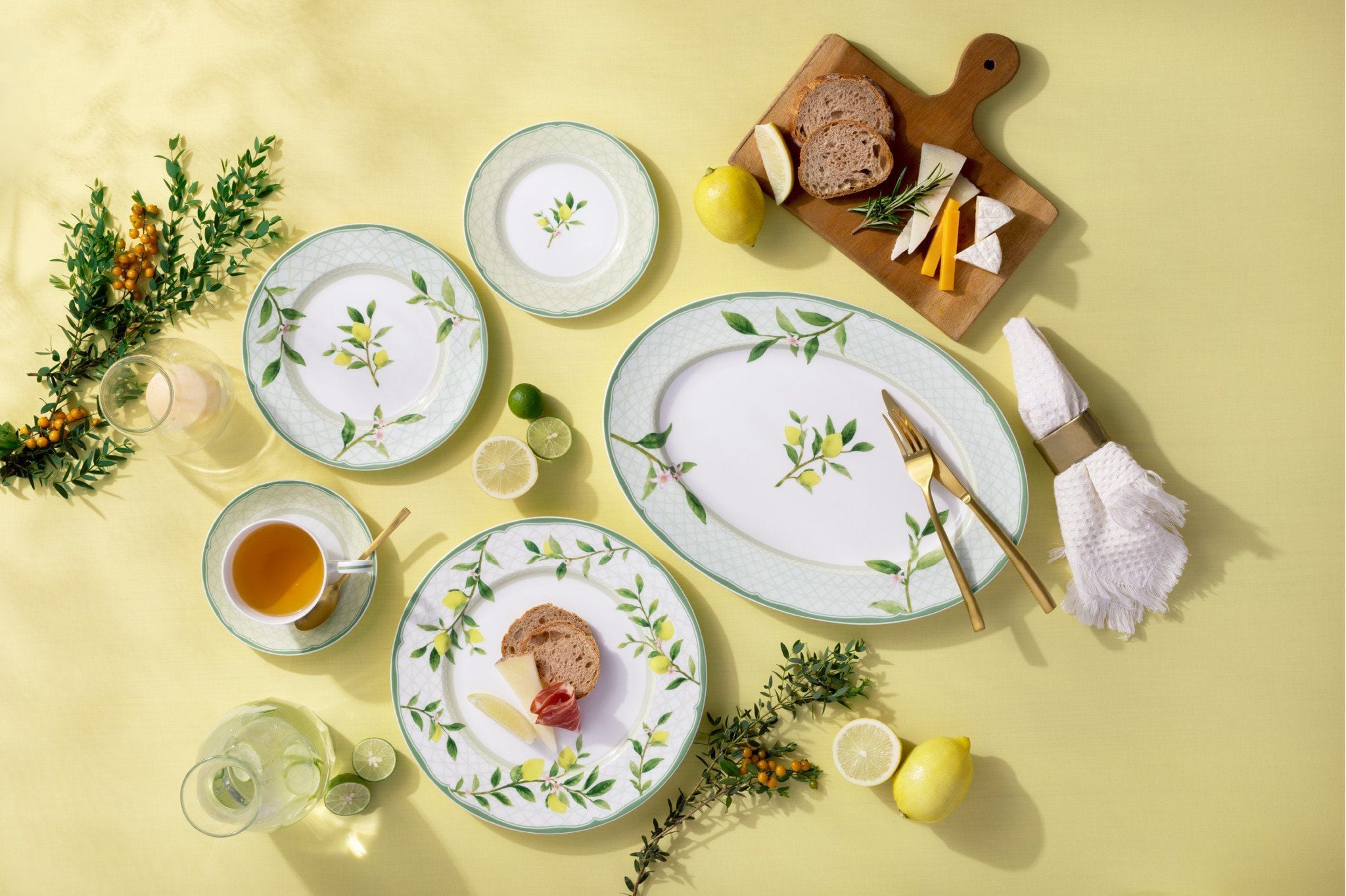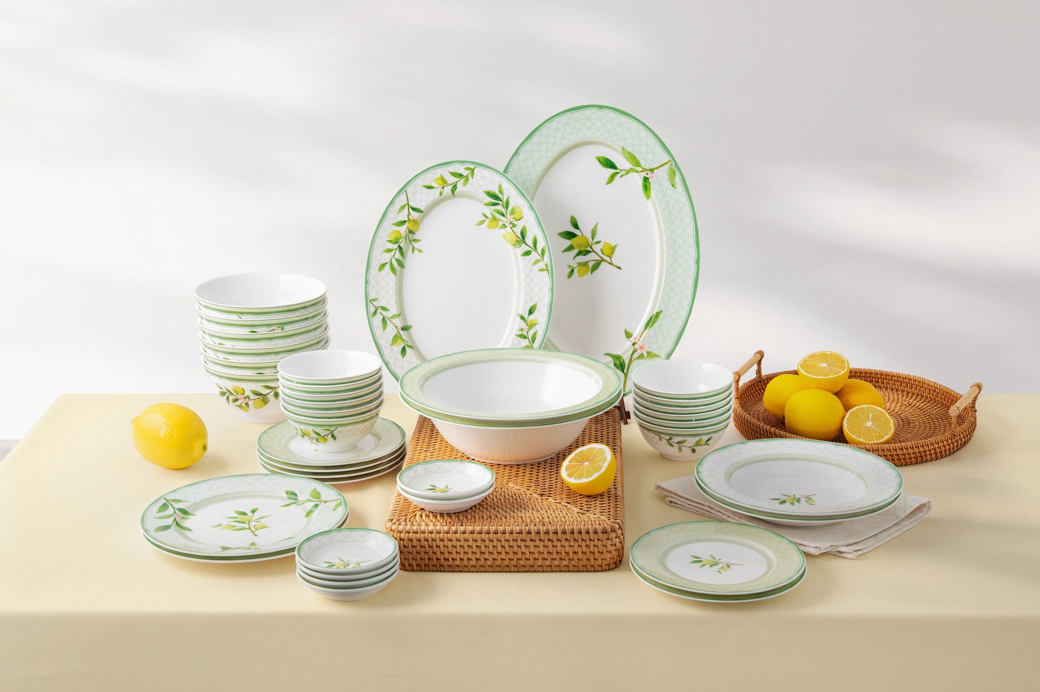 Trên nền men trắng mịn, những nhành chanh vàng và lá xanh được điểm tô tinh tế, tỏa ra nguồn năng lượng tươi mới như ánh sáng của mùa hè Địa Trung Hải.